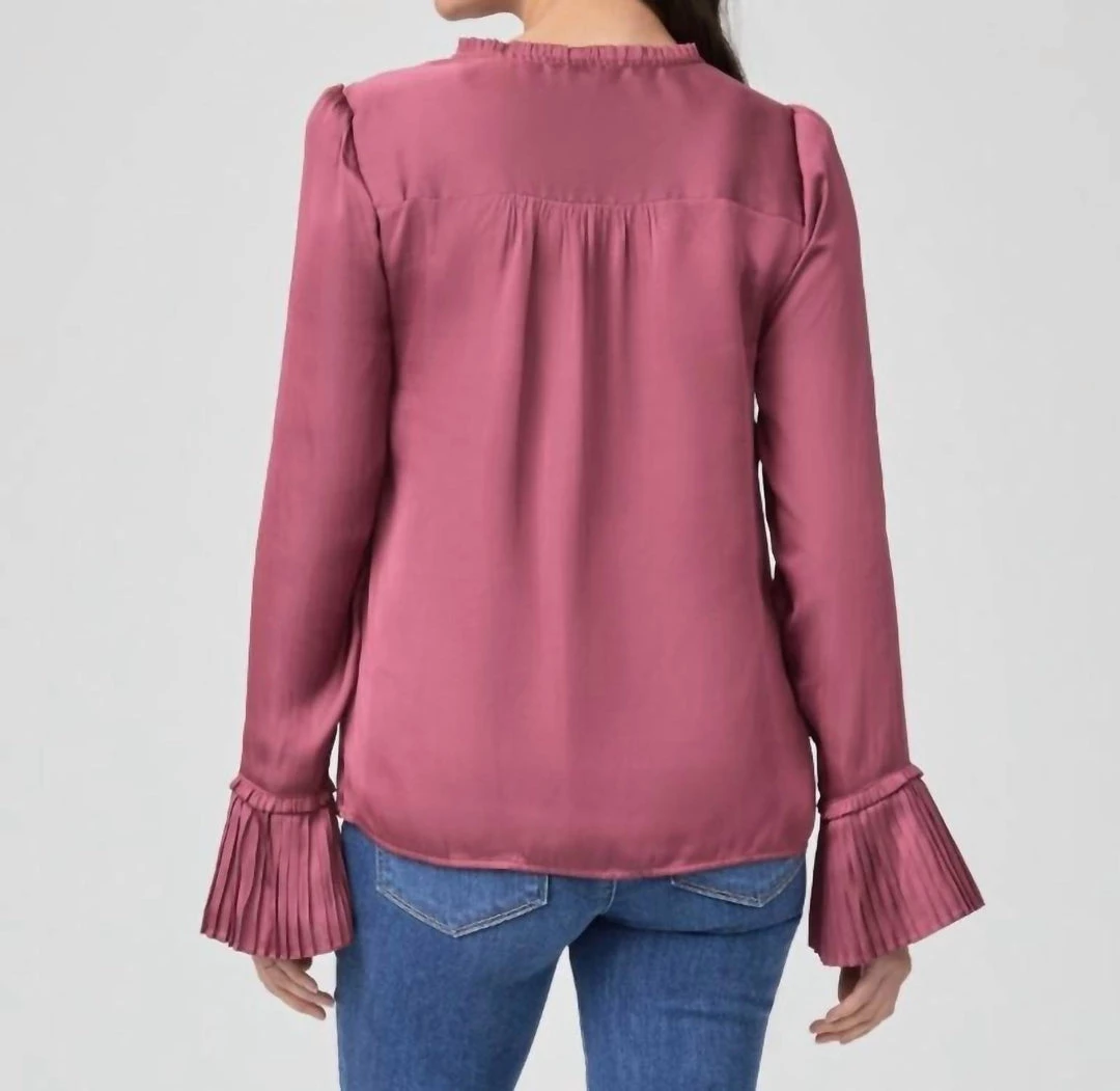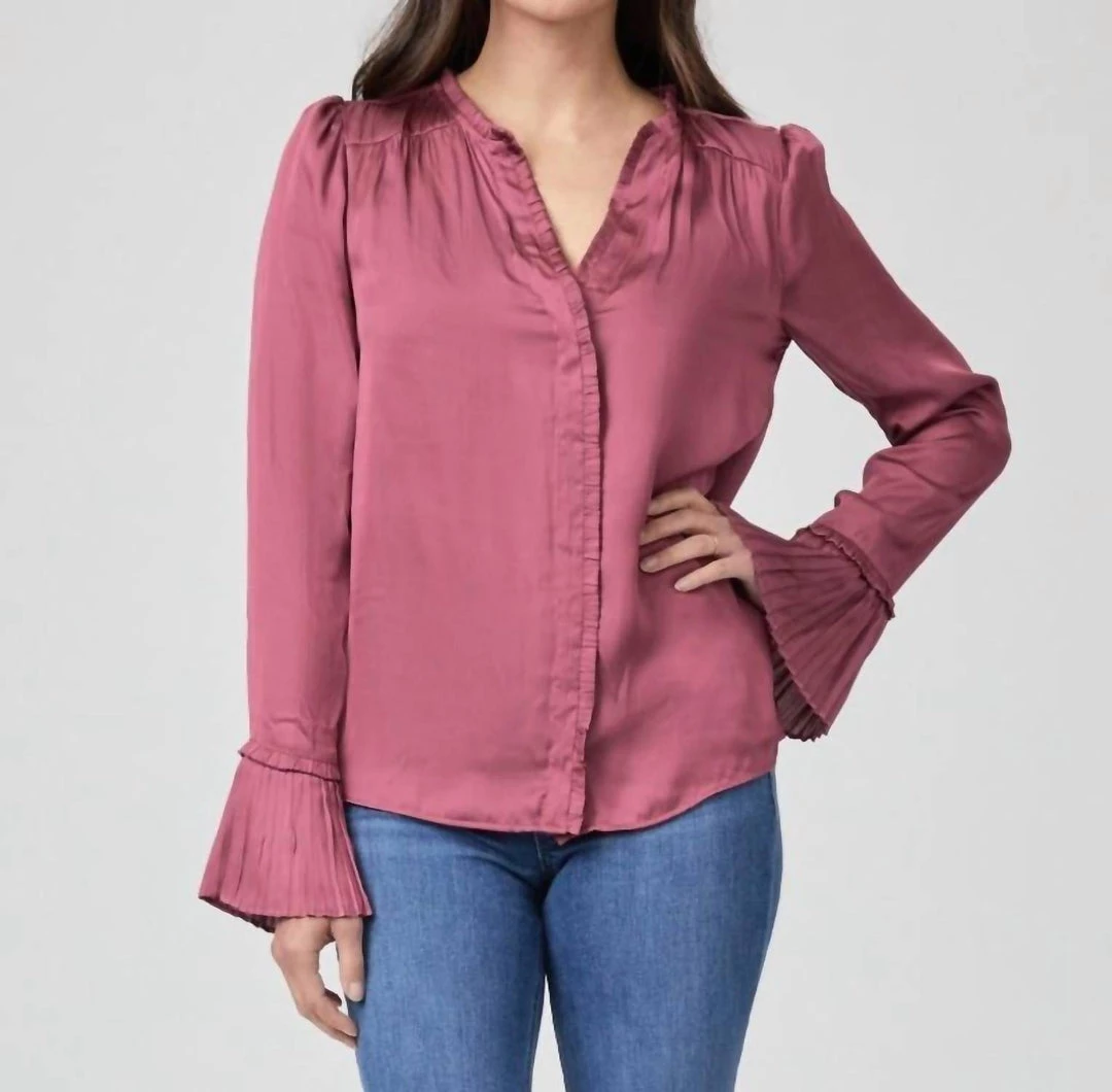 A 70’s-inspired long sleeve button-down blouse featuring a ruffle placket and pleated sleeve cuff details.